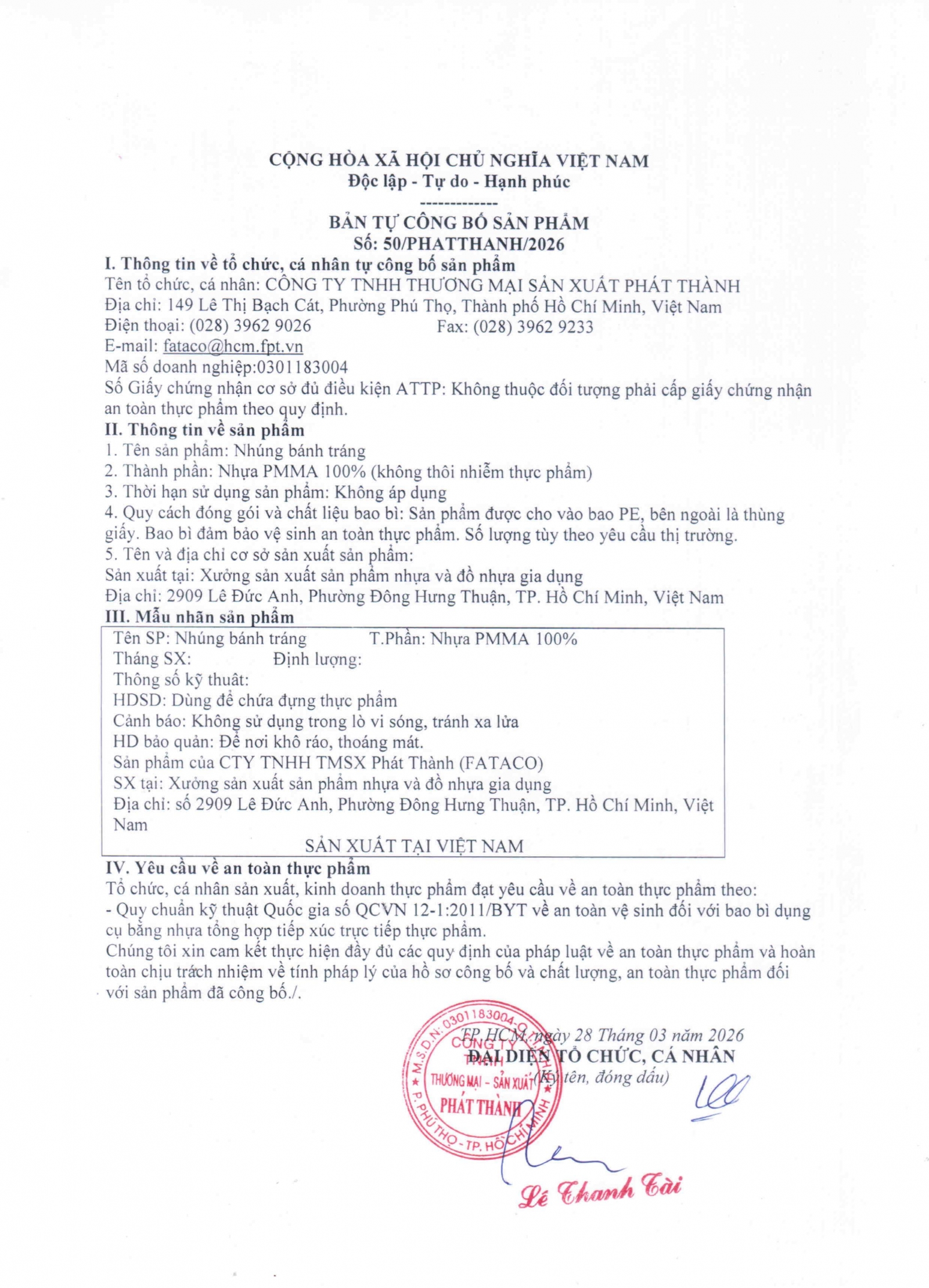 Công ty TNHH Thương mại - Sản xuất Phát Thành trân trọng thông báo sản phẩm tự công bố theo nghị định của chính phủ số 15/2018/NĐ-CP :